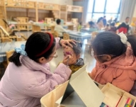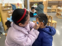 为了满足孩子们的心愿,我们特别邀请了丁芯瑶妈妈来到班级,为孩子们带来一场有趣的脸部彩绘活动。丁芯瑶妈妈化身彩绘师,一手拿着彩绘笔,一手轻轻扶住孩子的小脸,耐心地询问着每个孩子的想法。有的孩子想要一朵湖边的小花,有的孩子想要一只飞过湖面的小鸟,还有的孩子直接要求画上“梅龙湖”的波浪。画笔在丁芯瑶妈妈手中灵活转动,一朵朵、一只只、一道道生动的图案,很快就绽放在孩子们的脸颊上。